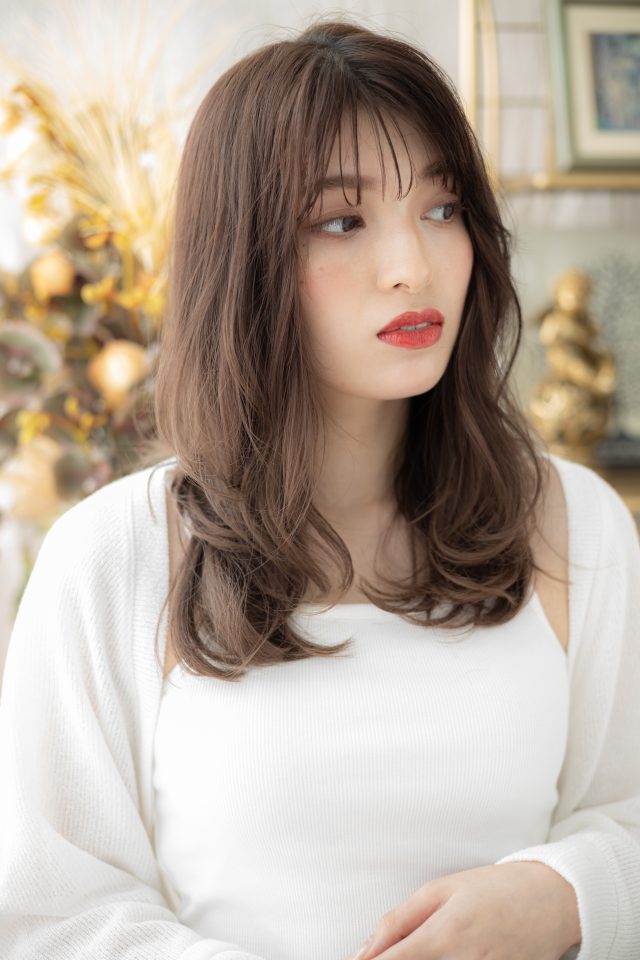 くせ毛風ゆるふわミディや耳かけ前下がりウルフも大人かわいい。斜めバング厚めバング、かきあげ前髪で小顔に。ナチュラルボブやフェミニンボブ、大人ボブ切りっぱなしボブ、前下がりボブも人気。(メイク担当:北浦和店成田)