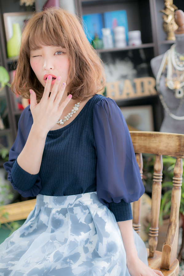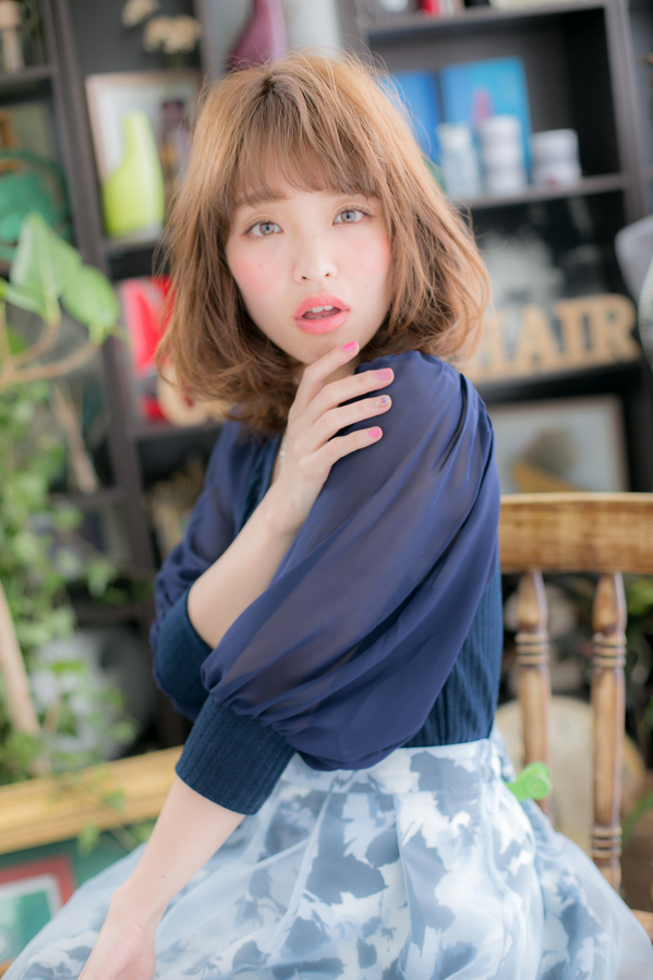 たっぷりの空気感を含んだエアリーふわミディ。前下がりで小顔見せ☆くせ毛風のリラクシーなラフカールで抜け感を♪無造作でもこなれ感ある大人女子風に。厚めバングや斜めバングも個性的。耳かけも大人かわいい。