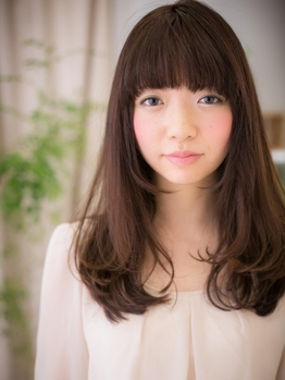 バングを目の上ギリギリで流すことで、目力アップな印象になります。ダークトーンでも、ふんわり内巻きにワンカールにすることで、やわらかな動きのある黒髪スタイルに。