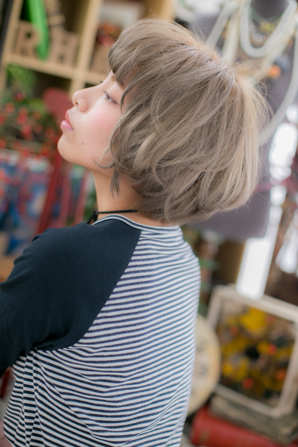 個性の映える攻めカラーがポイントのオシャレボブ。眉がチラ見えするショートバングと柔らかウェーブのかかったガーリーなボブスタイルに、思いっきり明るいアッシュカラーをオン。クールなショートスタイルにヘアチェンジ☆