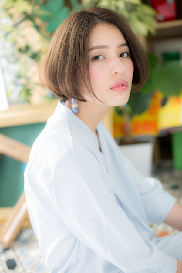 耳横ワンカールで丸みを持たせ、やわらかな雰囲気にしているので、クールフェミニンなハンサムボブに。耳かけで大人かわいい印象にしたり、エアリーカールでニュアンス感ある動きを出しても色っぽい。無造作なかきあげも◎