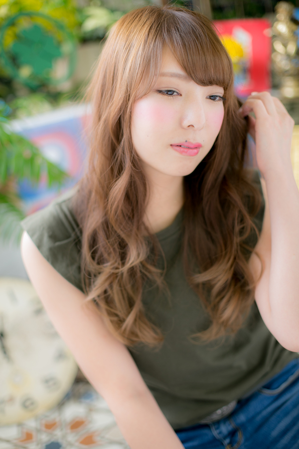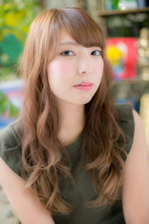 デジタルパーマでゆるめのウェーブを出したやわらか小顔スタイル。オイルとスタイリング剤を混ぜ、ツヤと動きを出しました。斜めバングや厚めバングでフェミニンにまとめても大人かわいい。(メイク担当:川口店 成田)
