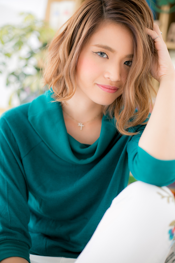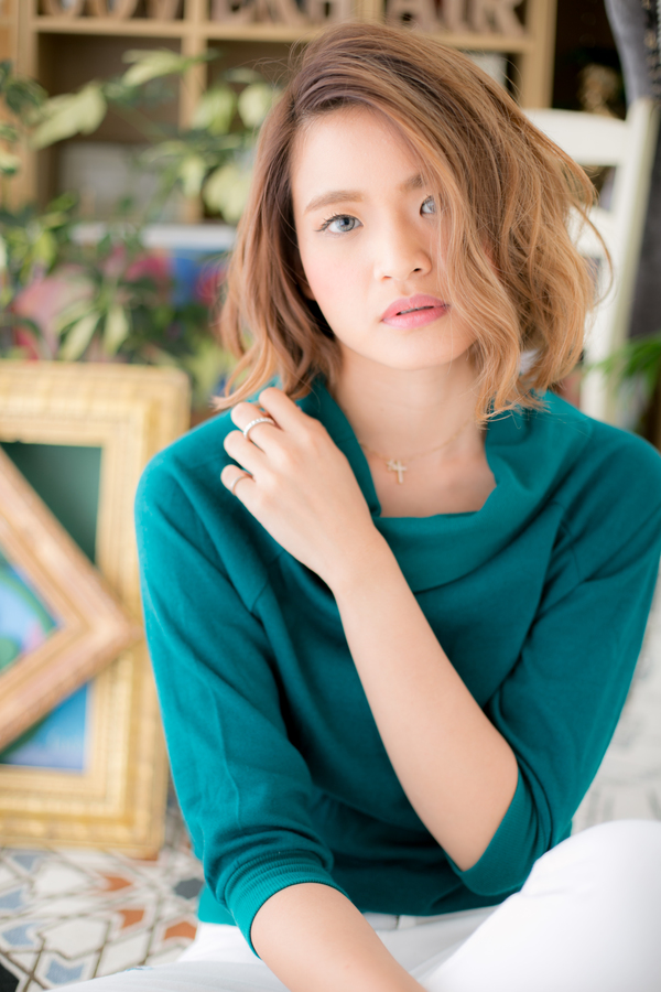 小顔効果ある前下がりボブに、くせ毛風のニュアンスカールをオン。空気感ある動きでアンニュイ顔に。グラデーションカラーでスパイスを加えて色っぽさをプラス。耳かけも大人かわいい。(メイク担当:北浦和店 近藤)