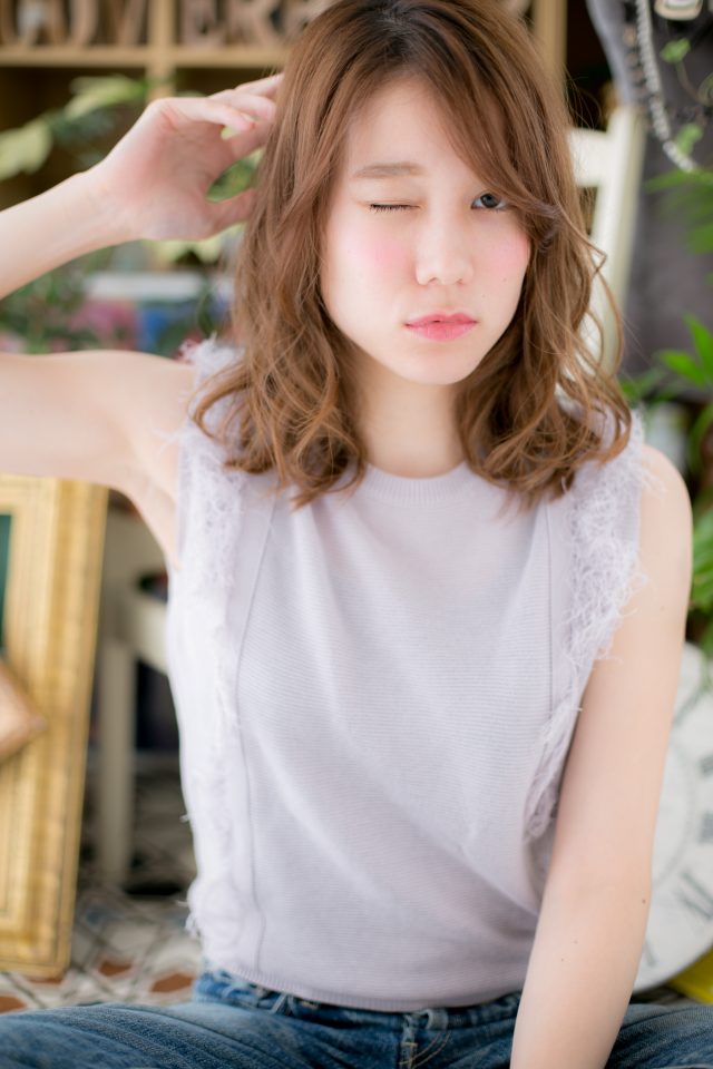 透け感ある斜めバングで表情をチラ見せした、色っぽかわいいふわミディ。厚めバングやワイドバングで個性的にしたり、耳かけも大人かわいい。くせ毛風カールのふわミディでモテ髪に♪(メイク担当:北浦和店 近藤)