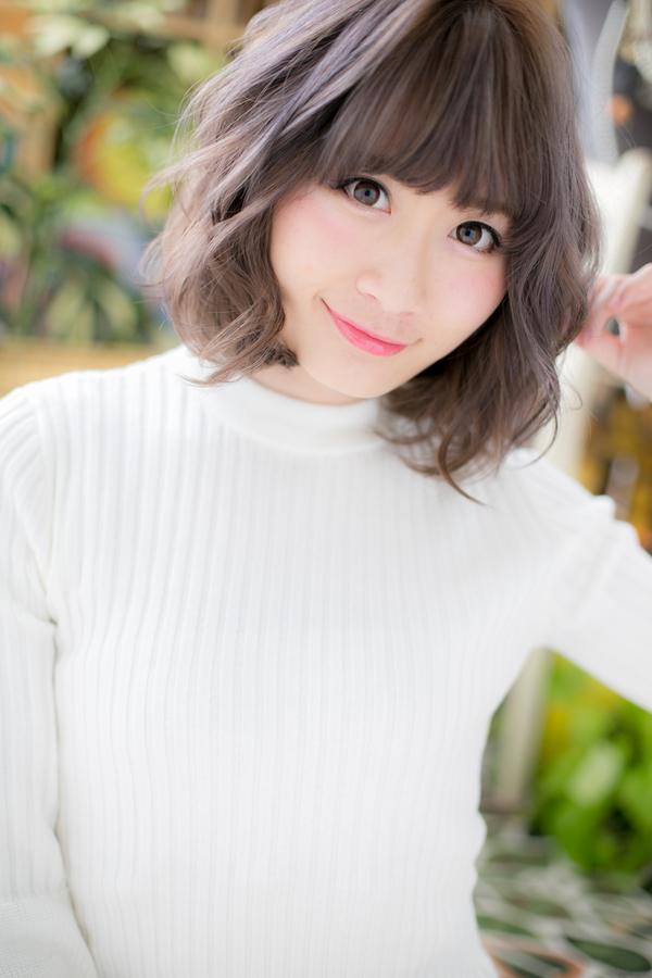 くせ毛風ランダムカールでボリュームを持たせて小顔見せなヘアスタイル。斜めバング&厚めバングで目力強調して大人女子のコーデを完成!。大人かわいいが詰まったラブふわミディは、耳かけしたりラフな抜け感ヘアアレンジもGOOD。ミディアムヘアを際立たせるグラデーションで人気のカラーもおすすめ!ピンク系のからーも◎(メイク担当:川口店 成田)