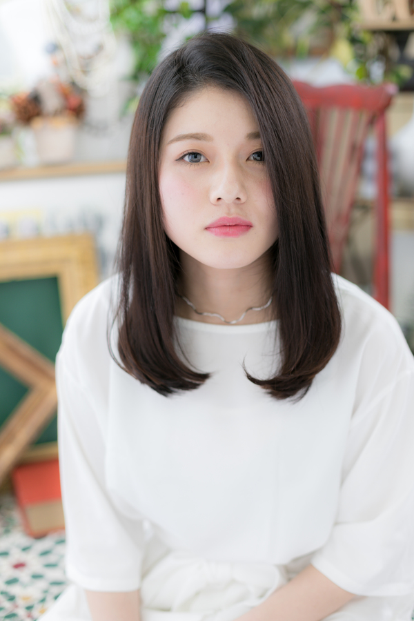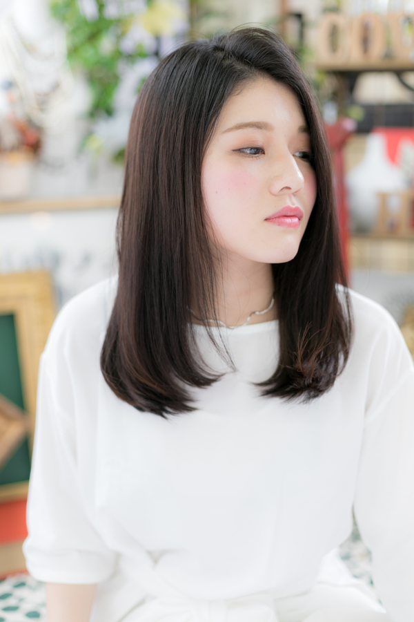 かきあげバング×黒髪のツヤ感色っぽセミディ