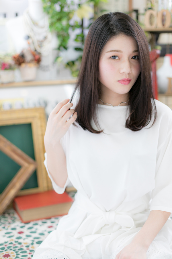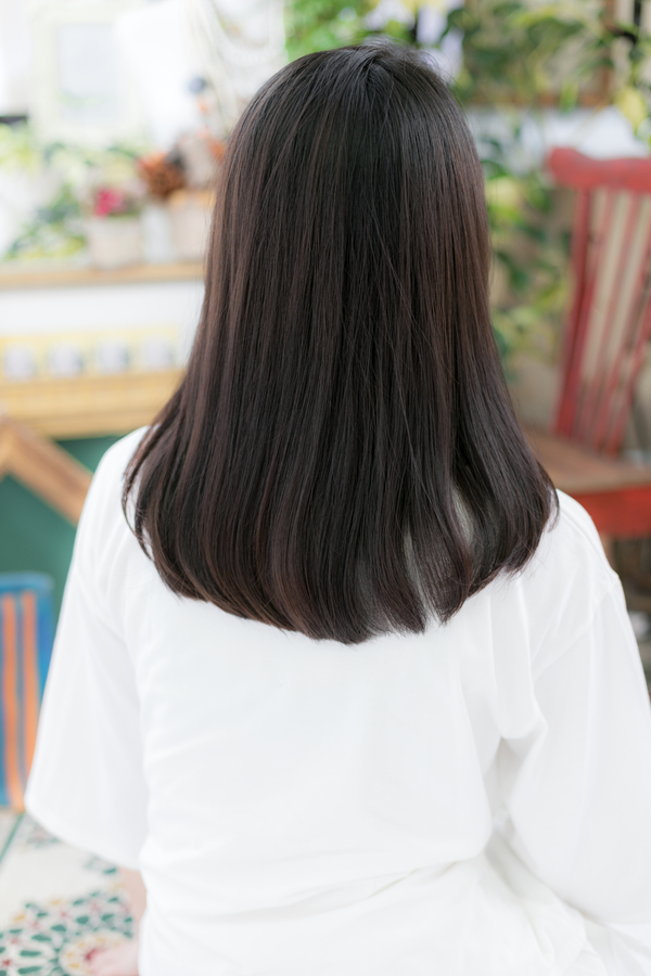 かきあげバング×黒髪のツヤ感色っぽセミディ