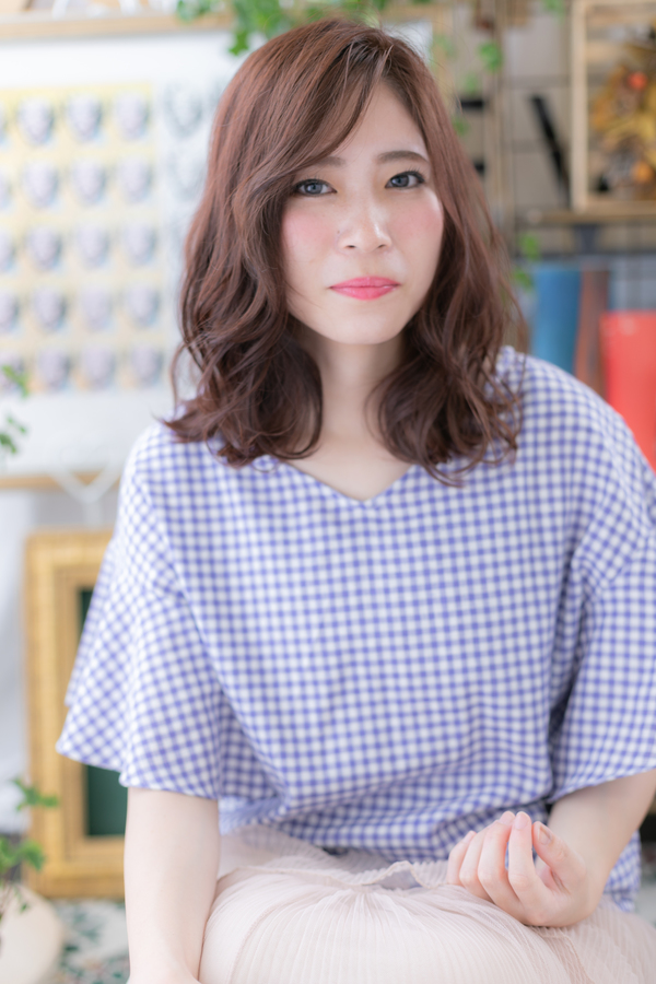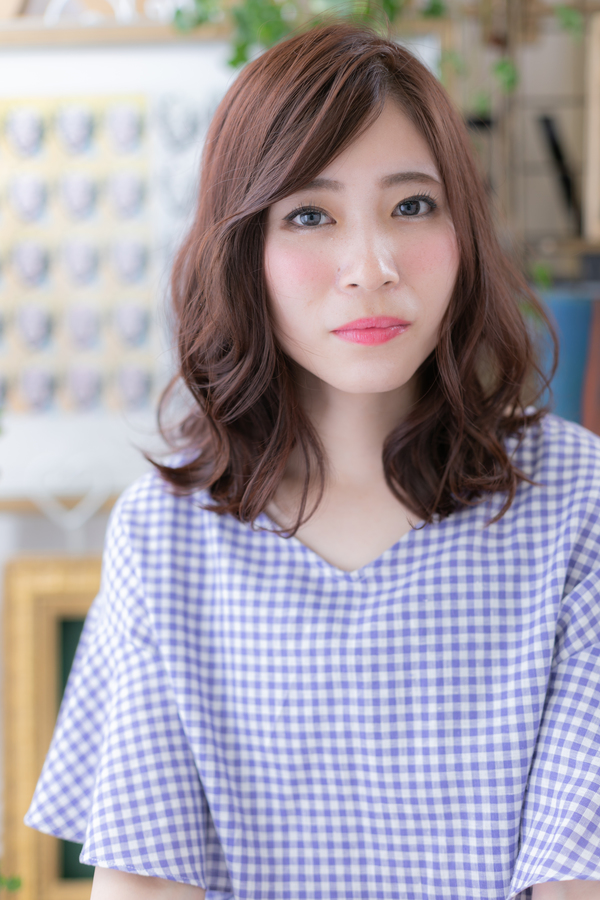 肩のラインでハネさせたくせ毛風の外ハネふわミディ。少し長めのスタイルが大人かわいいプラス大人女子力UP。斜めバングや厚めバングで目力強調したり、耳かけや小顔見せ前下がりもGOOD。トリートメントしたようなカラーリングで髪の毛の悩みも解決。人気のカラーやピンク系カラーもおすすめ!30代・40代にも人気のヘアスタイルです。(メイク担当:北浦和店 今野)