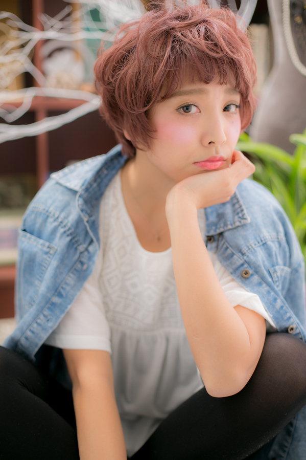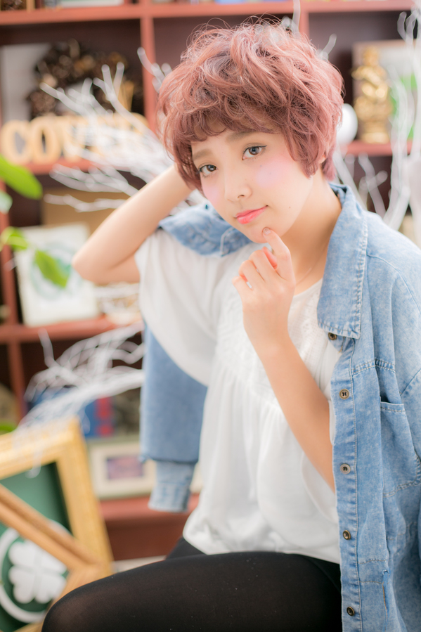 ふんわりカールに可愛いピンク系のカラーで一気にカジュアルに☆眉上バングがより個性をUPさせます。カールが柔らかいので奇抜過ぎずナチュラルなオシャレスタイルに。