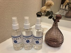 噴霧器による空間除菌をしっかりさせていただいております。また、そちらに使用している次亜塩素酸精製水消毒液は