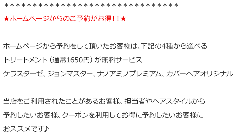 ↑こちらでご予約の方は、ケラスターゼ・ジョンマスターなど4種の選べるトリートメント(1500円)が無料♪