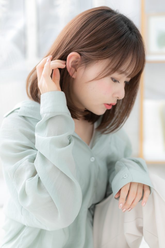 ツヤと透明感で周囲と差をつけた美髪ナチュラルミディ。ナチュラルボブやフェミニンボブ、大人ボブや前下がりボブからのイメチェンにGOOD。くせ毛風ゆるふわミディや耳かけも大人かわいい。(メイク担当:川口店 岩淵