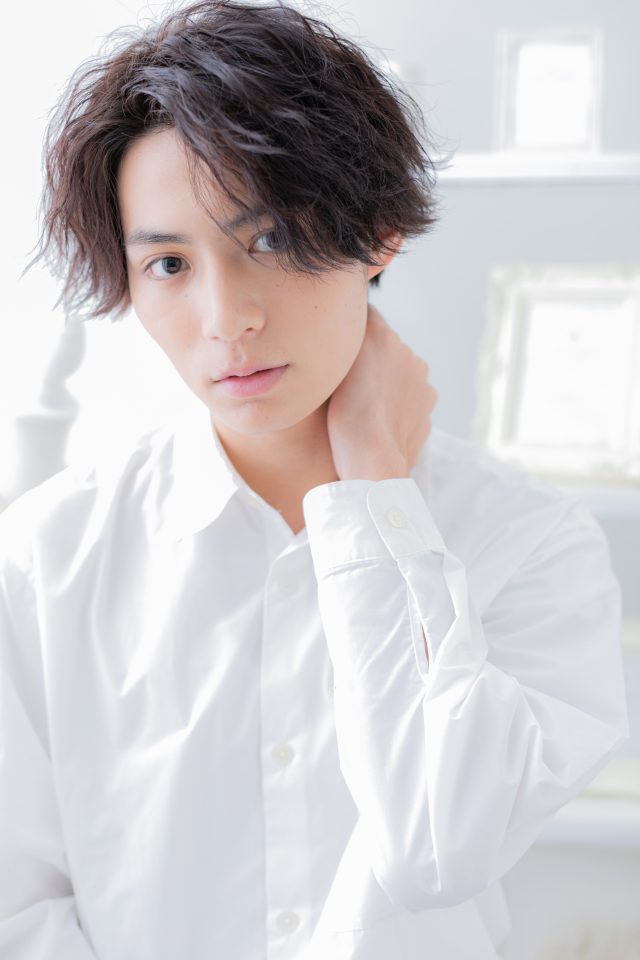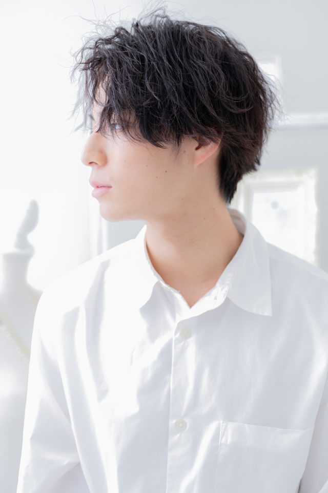 くせ毛風パーマでやわらかな雰囲気にしたフェザーマッシュショート。かきあげ前髪で無造作にしたり、オールバックやスリックバックもカッコイイ。韓国風マッシュやツイスパも人気。(メイク担当COVERHAIRGROUP伊与田)