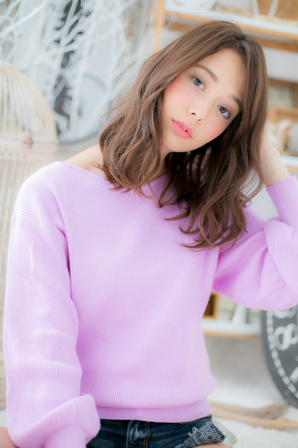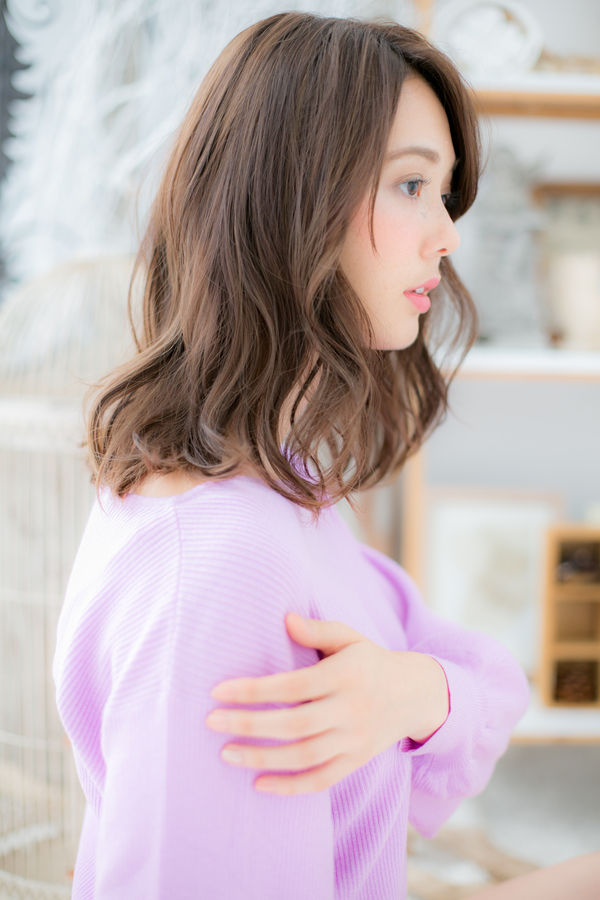 くせ毛風カールがフェミニンで大人かわいいふわミディなヘアスタイルに。耳かけやワンサイドで色っぽくしてもOK。ノーバングでラフにヘアアレンジしたり、斜めバングや厚めバングで目力UPしても大人女子のファションにおすすめ。人気のカラーで髪の毛の悩みも解消する!(メイク担当:COVER HAIR GROUP成田)