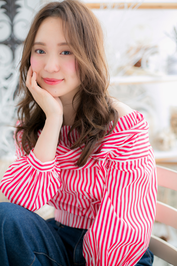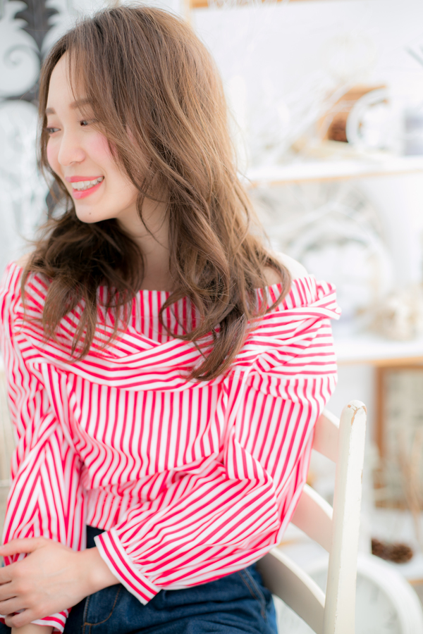 耳横からのゆるやかなボリュームカールでAラインフォルムを作ったグラマラスロング。センターパートでヒッピーライクに仕上げ、カジュアルで大人かわいい印象に。顔周りを明るく華やかに見せつつ、小顔対策もバッチリ!