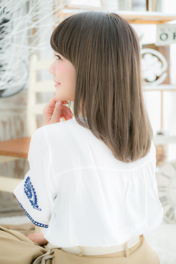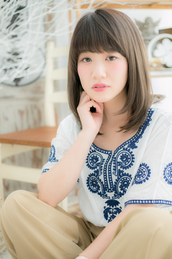 ペタっと平面的になりがちなナチュラルボブは、ガーリーな厚めバングとふわっとした空気感を加えて、ほんわかAラインを表現。ボブからの伸ばしかけの方にもオススメ。王道の好感ストレートミディでとびきり可愛く♪