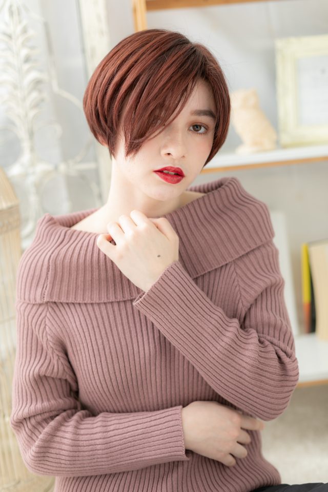 前下がりで小顔に見せたシンプルなナチュラルボブは外国人風ボルドーやレッド系カラー、人気のカラー髪の毛の悩みも解決。周囲と差を付けた格上げ大人ボブは耳かけでアシンメトリーヘアアレンジ大人女子のファッション度UP。(メイク担当:COVERHAIRGROUP棟方)