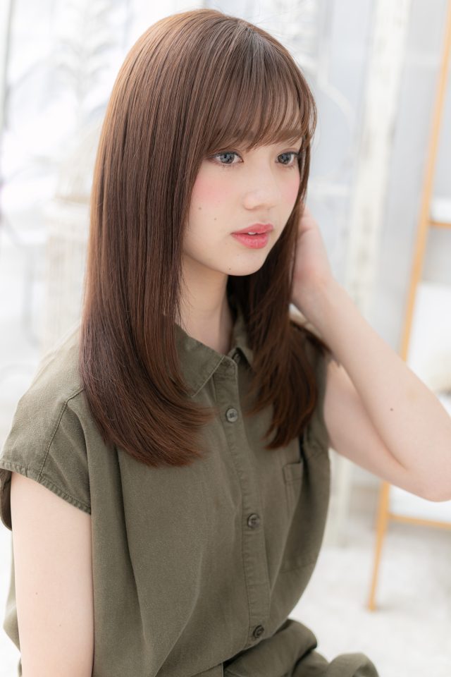 シースルーバングで表情をチラ見せした大人かわいいワンカールセミディ。斜めバングや厚めバングで目力UPしたり前下がりで輪郭カバーして小顔見せもOK。耳かけやふわミディもモテ髪型。(メイク担当:COVERHAIRGROUP成田)