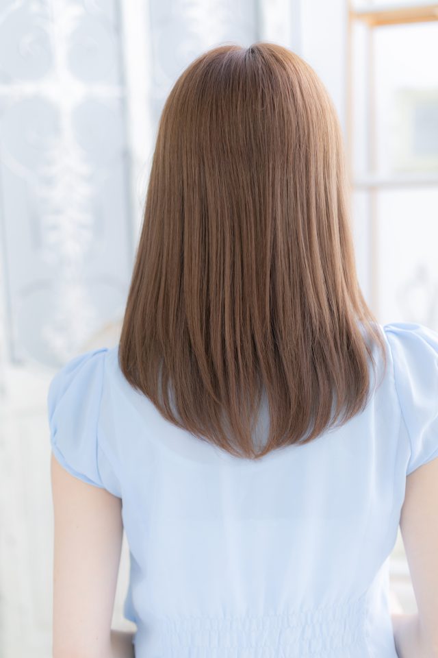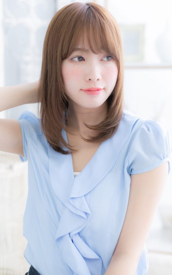 前下がりで輪郭カバーして小顔にメイクしたワンカールセミディのヘアスタイルで大人女子のファッション度UP。ミディアムヘアを際立たせるグラデーションやベージュの暗めの髪の色もおすすめ!(メイク担当:COVERHAIRGROUP 成田)