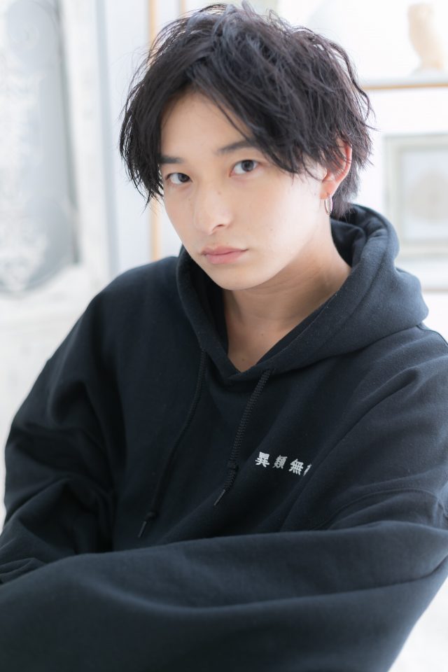 重めスタイルに見えがちな黒髪センターパートはくせ毛風パーマでラフな動きをつけてトップにボリュームを。かき上げヘアでスッキリ見せたり、ビジネスシーンではワイルドアップバングもGOOD。カタログでも人気!(メイク担当:北浦和店 棟方)