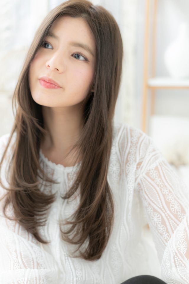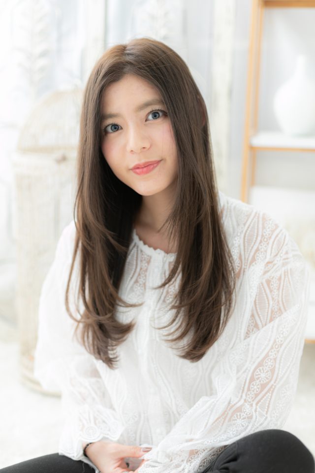 無造作かき上げバングでラフ&リラクシーに仕上げたワンカールロング。重めスタイルでも、ツヤ感レイヤーで軽くやわらかな印象に。くせ毛風カールを付けたりふわミディからの伸ばしかけにもGOOD。耳かけも大人かわいい。