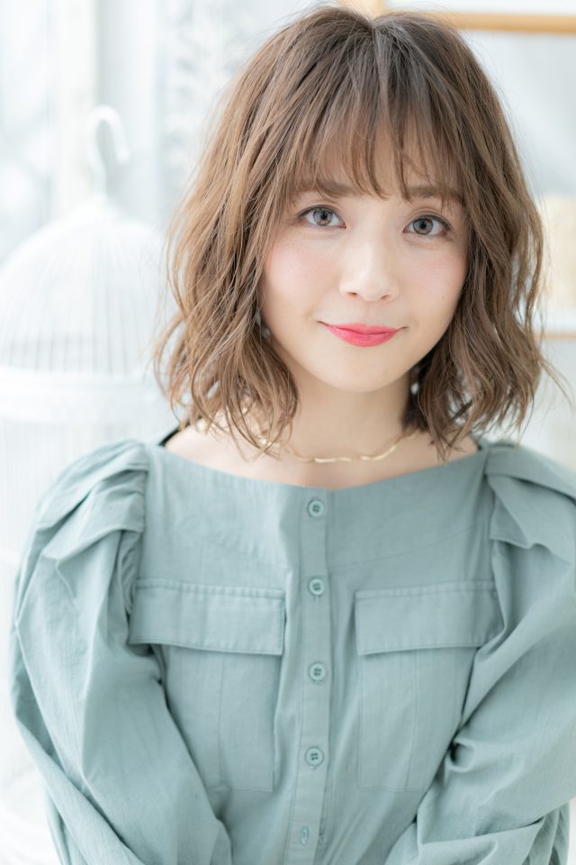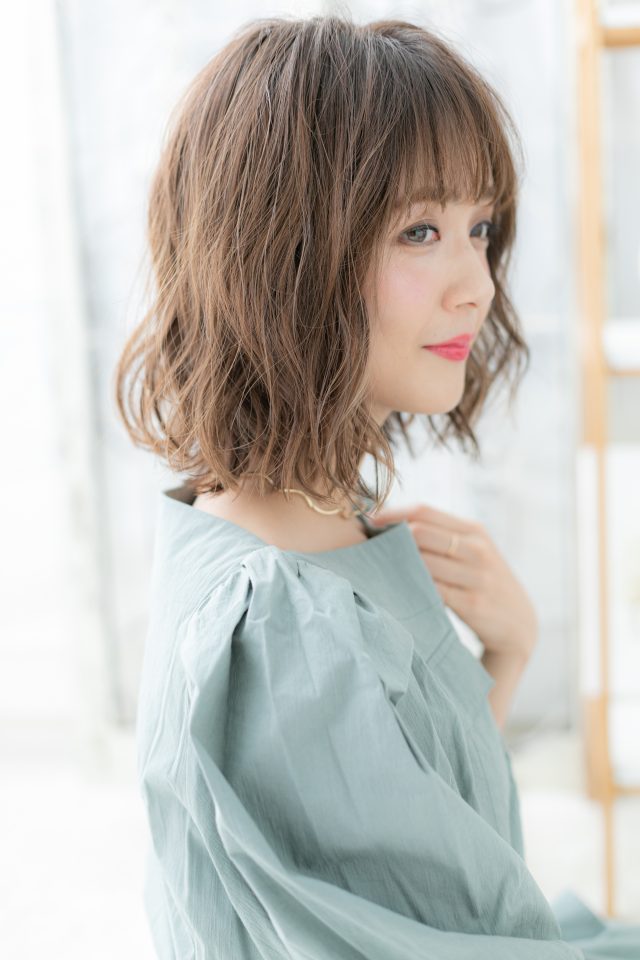 シースルーバングで抜け感を出して大人かわいい雰囲気に仕上げた外国人風フェミニンボブ。前下がりで小顔見せ。ナチュラルボブや大人ボブ、前下がりボブからのイメチェンにオススメ。(メイク担当:COVERHAIRGROUP岩淵)