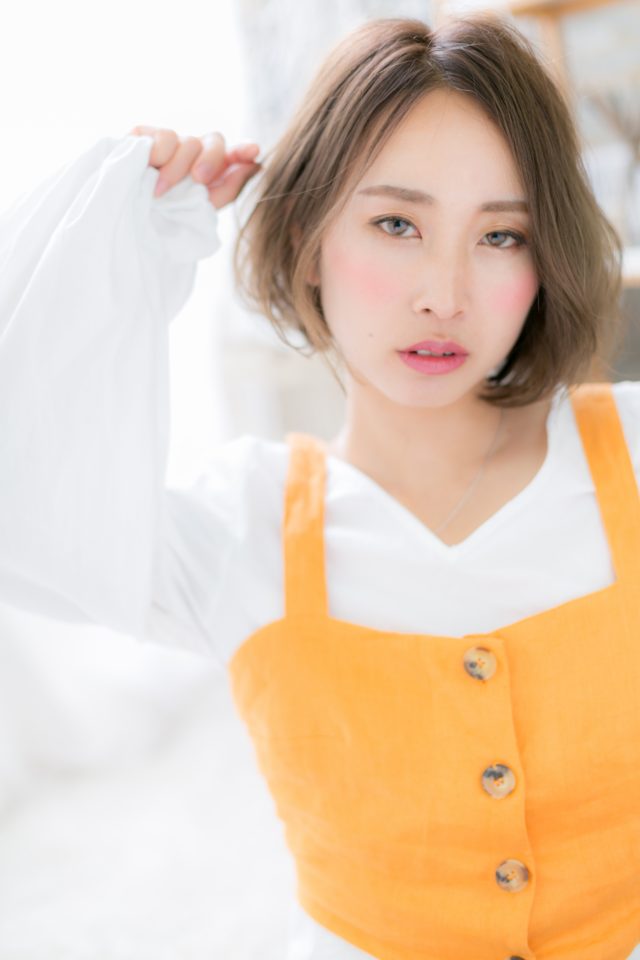 耳周りに前下がりのくせ毛風ニュアンスカールをかけることで、小顔効果大のひし形フォルムのフェミニンボブに。揺れるような動きが大人かわいい。ナチュラルボブからのイメチェンに♪(メイク担当:COVERHAIRGROUP 成田)