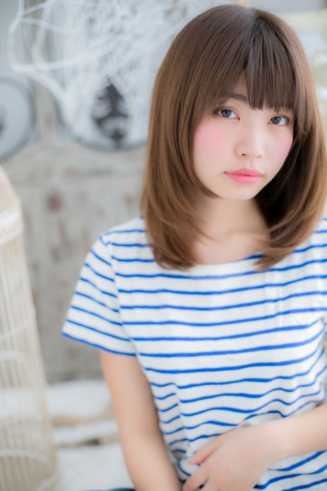 フリンジバングから目元をチラ見せしてキュートな表情を作るモテミディ。頬のラインに沿った毛流れで小顔対策もバッチリ!ミルクティカラーやベージュカラーで透明感を出して☆カジュアル~フェミニンまでイメチェンOK!