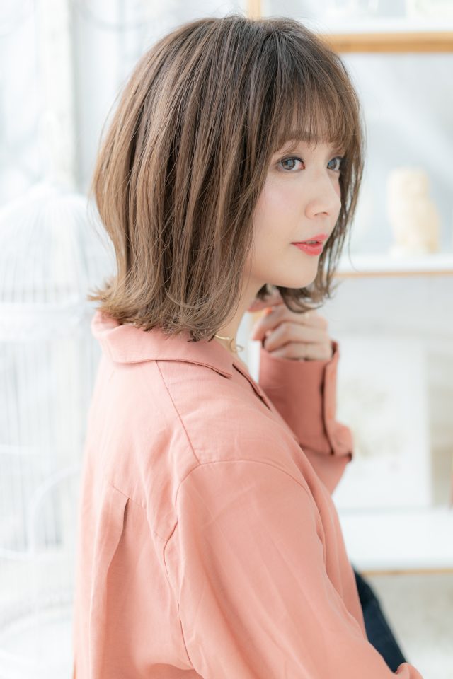 シースルーバングで抜け感を演出した前下がりの小顔ボブで大人女子のファッション度UP。ミディアムを際立たせるグラデーションやベージュの暗めの紙の色もおすすめ!(メイク担当:COVERHAIRGROUP岩淵)
