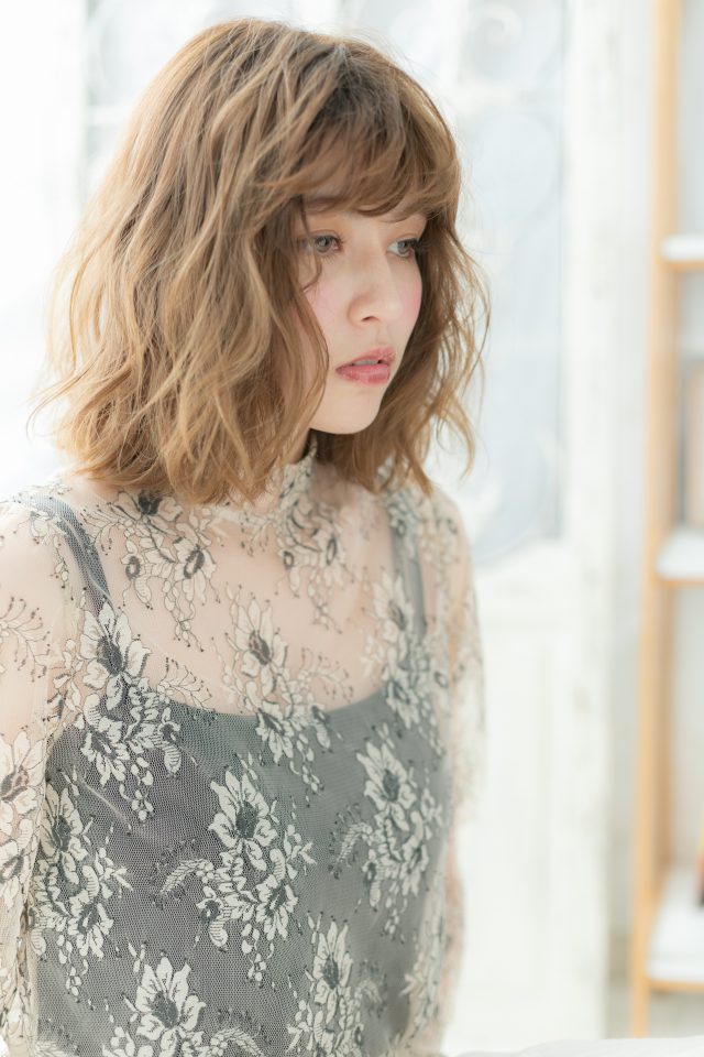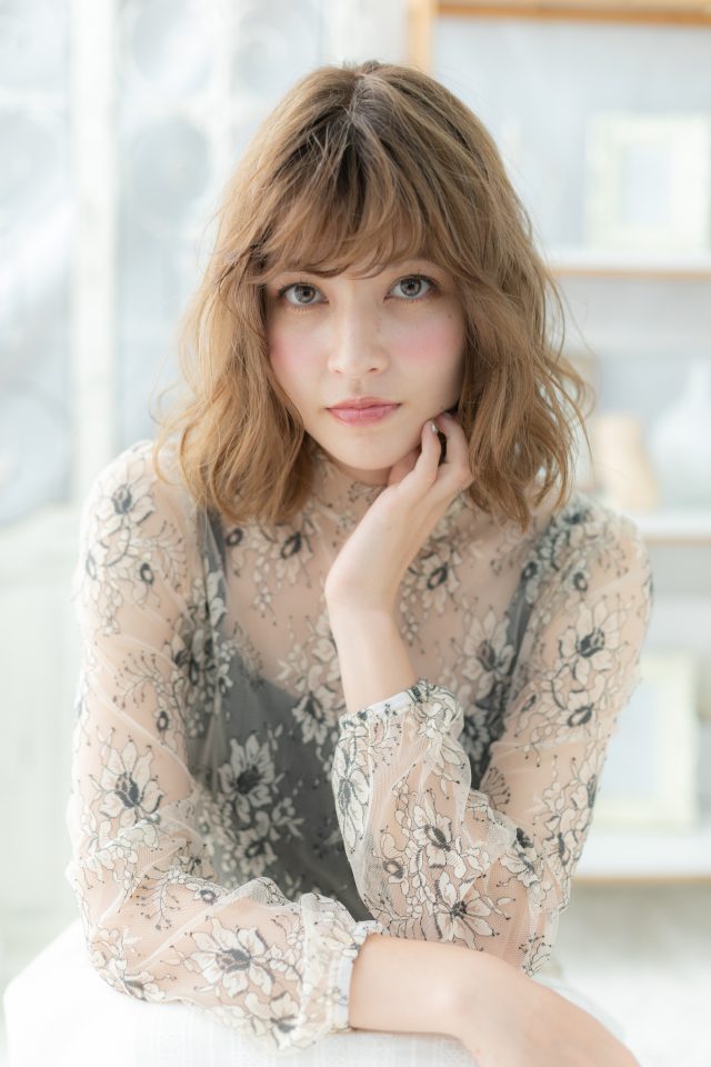 外国人風ベージュカラーとくせ毛風フリンジウェーブでリッチ&グラマラスに格上げしたゆるふわミディ。ナチュラルボブやフェミニンボブ、大人ボブや前下がりボブからの伸ばしかけにもGOOD。(メイク担当:川口店 成田)