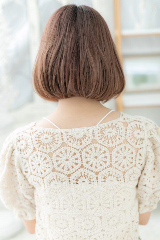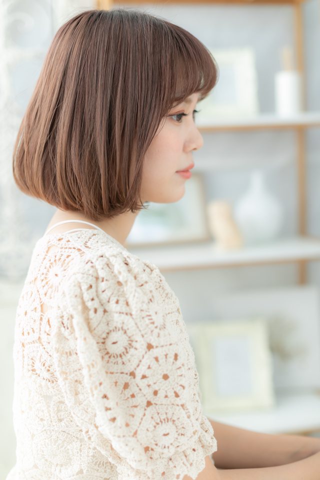 頬ラインに沿った前下がりワンカールで輪郭カバー。小顔見せを叶えるナチュラルボブで大人女子のファッション度UP。フェミニンボブや大人ボブ、エアリーボブや前下がりボブなどのヘアアレンジもOK。30代・40代にもおすすめ!