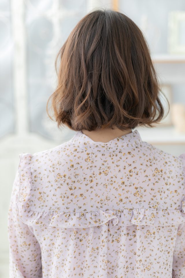 透け感あるオン眉の斜めバングで目元を印象付けたくせ毛風ゆるふわミディで大人女子のコーデを完成。ナチュラルボブやフェミニンボブ、大人ボブや前下がりボブからの伸ばしかけに◎のヘアスタイルです。30代・40代にもおすすめ。(メイク担当:北浦和店 棟方)