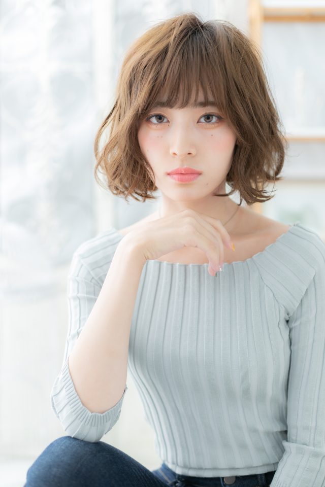 シースルーバングとレイヤーカットで透け感を出してラブカジュアルに/ナチュラルボブやフェミニンボブ,大人ボブや前下がりボブからのイメチェンにオススメ/ミルクティーブラウンやシアーカラーも旬の髪型/20代/30代/40代