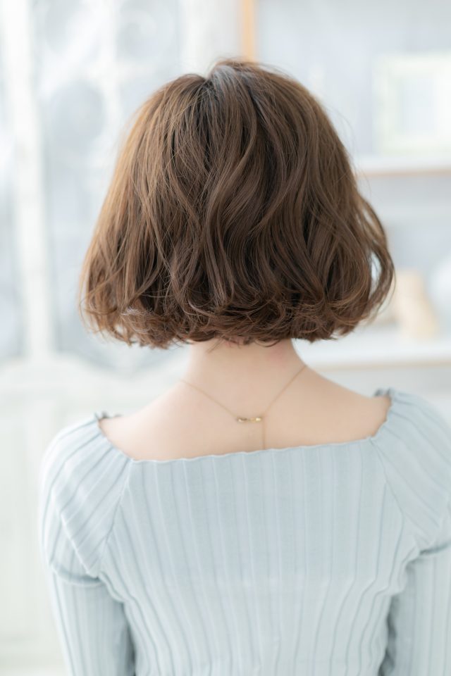 くせ毛風カールで大人かわいい雰囲気に仕上げた外国人風ふわミディ。前下がりで輪郭カバーして小顔見せ大人女子のコーデを完成。ミディアムヘアを際立たせるグラデーションもおすすめ!(メイク担当:COVERHAIRGROUP中田)