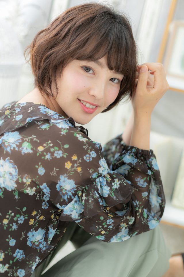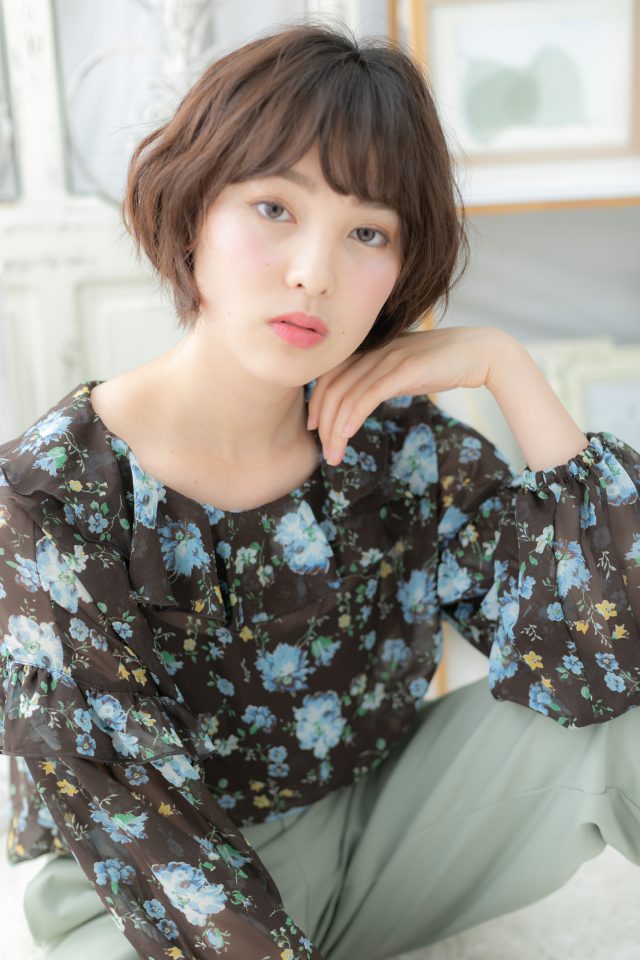 斜めバングと前下がりで小顔に仕上げたくせ毛風エアリーボブのヘアスタイル。ナチュラルボブやフェミニンボブ、大人ボブや前下がりボブからの伸ばしかけにおすすめ!(メイク担当:北浦和店 棟方)