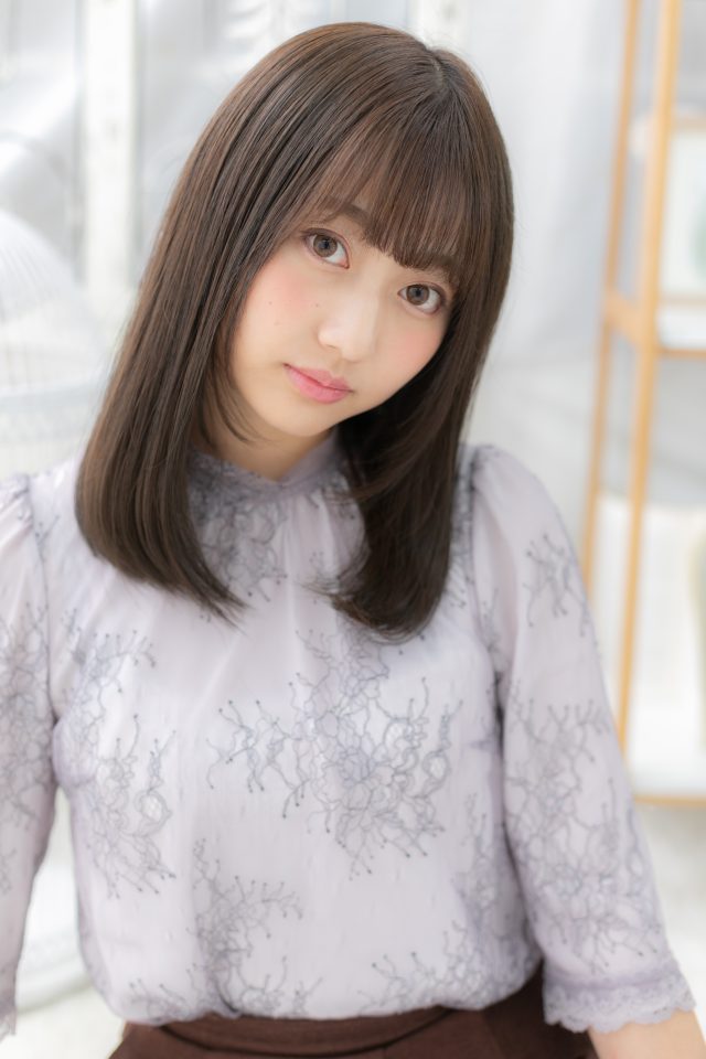 ノームコアなナチュラルミディはレイヤーカットとシースルーバングで軽さと透明感を演出。黒髪ダークカラー、ローライトでも重くなりません。斜めバングや厚めバングで目力UPしてもOK。(メイク担当:北浦和店 棟方)
