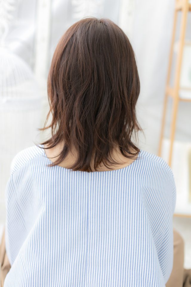 オン眉でガーリーに仕上げたゆるふわミディ。毛先パーマでエアリーに仕上げれば黒髪やローライトでも重くなりません。前下がりで小顔見せ。斜めバングや厚めバングで目力UPも大人かわいい。(メイク担当:川口店 成田)