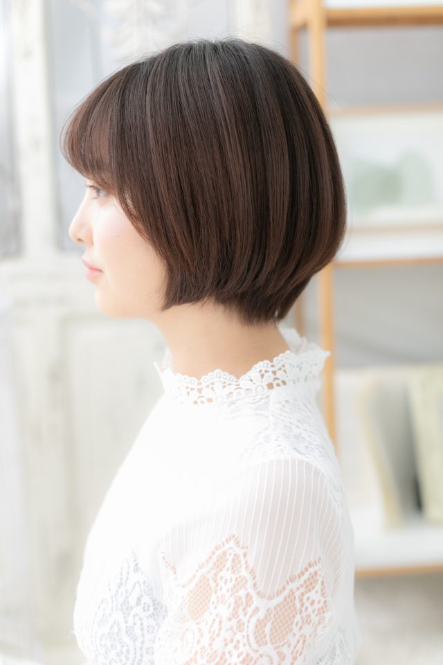似合わせカットの技が光るシンプルなナチュラルボブ。ツヤ感あるダークカラーで大人かわいい雰囲気に。フェミニンボブや大人ボブ、前下がりボブなどイメチェンも楽しい。耳かけしても◎(メイク担当:北浦和店棟方)