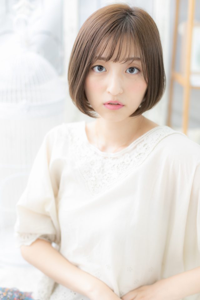 輪郭をカバーして小顔見せ効果を狙った前下がりボブ。シースルーバングで透け感を出して大人かわいい雰囲気に。ナチュラルボブやフェミニンボブ、大人ボブやふわミディなどイメチェンも◎(メイク担当:川口店成田)