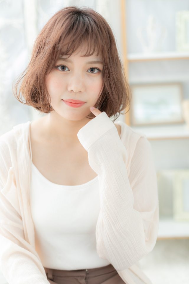 大人かわいいAラインピンクベージュ小顔ロブ