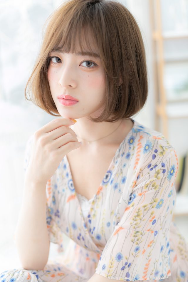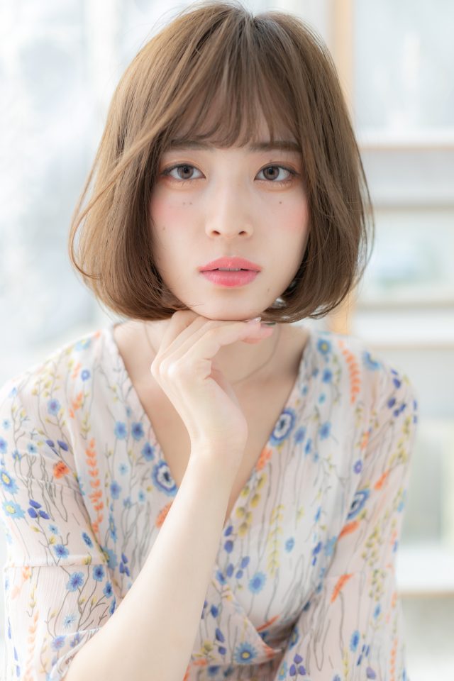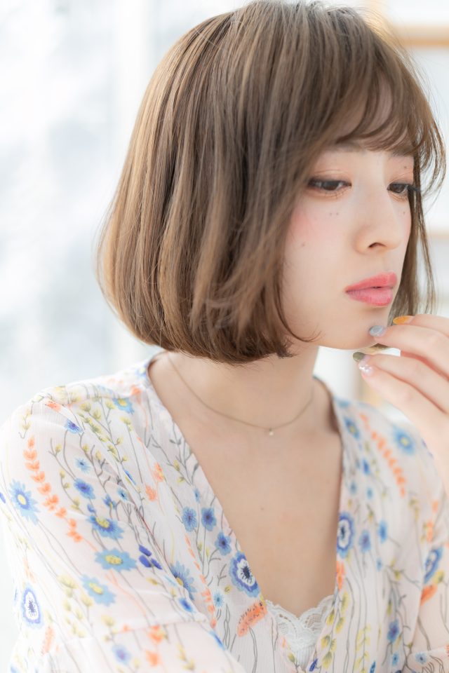 輪郭カバーする前下がりワンカールで小顔見せしたナチュラルボブ。シンプルな髪型はヘアアレンジも多彩。前下がりボブやフェミニンボブ、エアリーボブや大人ボブなどイメチェンも◎(メイク担当:COVERHAIRGROUP中田)