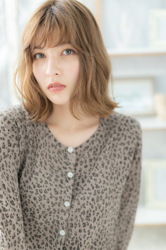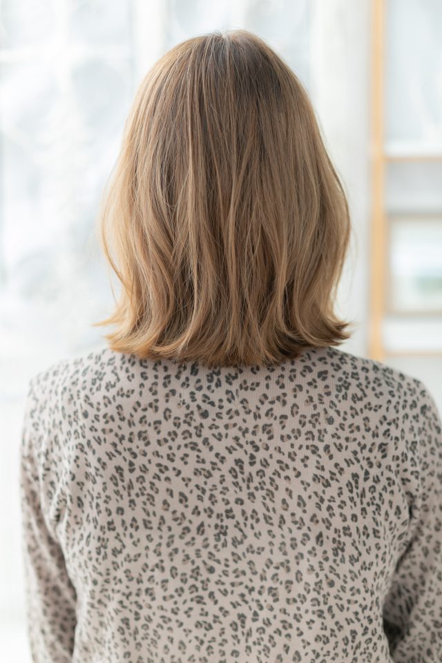 ラブカジュアルな印象の外ハネミディは外国人風のグラデーションカラーでグラマラスな髪型に。前下がりで輪郭カバーして小顔に。斜めバングや厚めバングで目力UP。耳かけも大人かわいい。(メイク担当:川口店 成田)