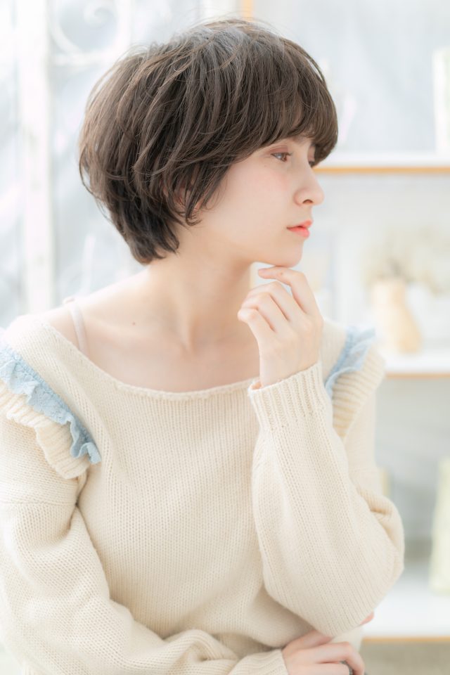ボーイッシュに見えがちなマッシュショートをガーリーにヘアアレンジした大人ショートで大人女子のコーデも完成くせ毛風ニュアンスカールで動きを出し黒髪風ダークカラーでシックなヘアスタイル。30代・40代にもおすすめ!(メイク担当:COVERHAIRGROUP中田)