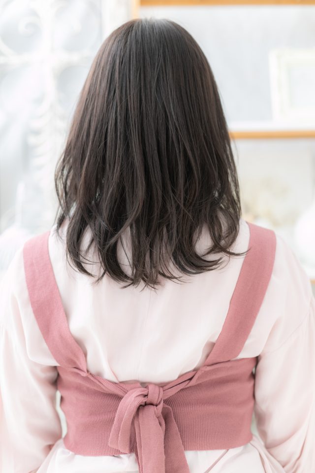 重めスタイルに見えがちな黒髪スタイルは、透け感レイヤーミディアムでニュアンス感ある動きを出して大人女子のファッション度UP。前下がりで小顔見せもOK。30代・40代にもおすすめ!