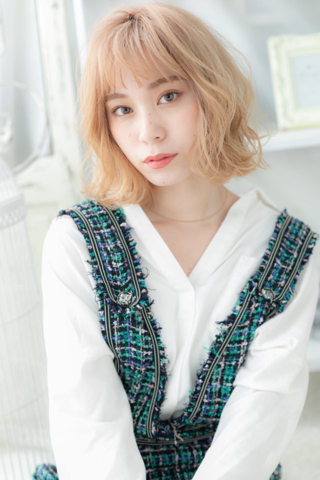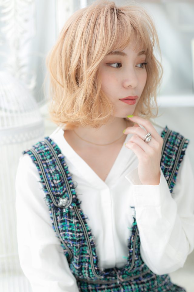 くせ毛風ゆるふわミディはハイトーンカラーで甘辛ミックスに。耳かけや小顔前下がりも大人かわいい。ナチュラルボブやフェミニンボブ、大人ボブや前下がりボブからの伸ばしかけに◎斜めバングや厚めバングで目力強調。