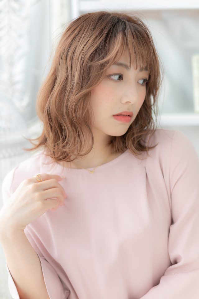 斜めバングや厚めバングが大人かわいいくせ毛風ふわミディ。前下がりで小顔。ナチュラルボブやフェミニンボブ、大人ボブや前下がりボブからの伸ばしかけに◎耳かけやアシンメトリーな髪形も◎(メイク担当:川口店 岩淵)