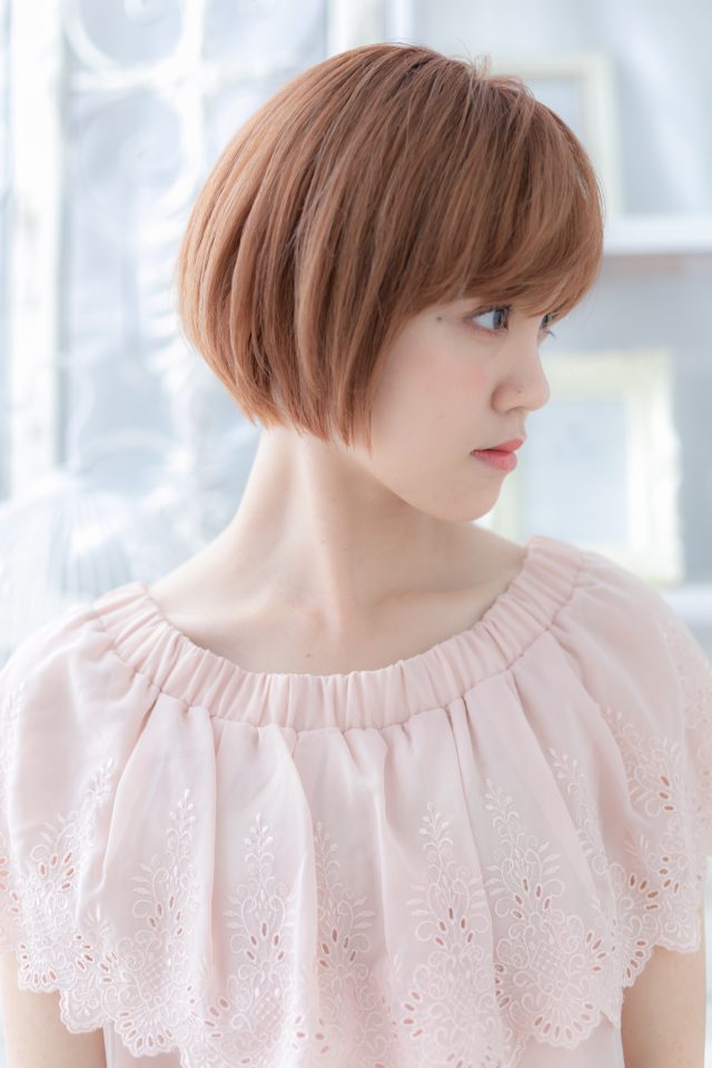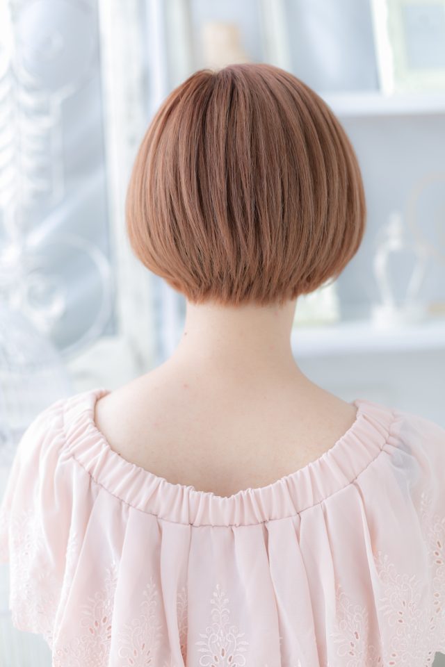 ピンクカラーが大人かわいい前下がりミニボブ