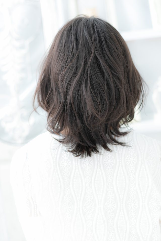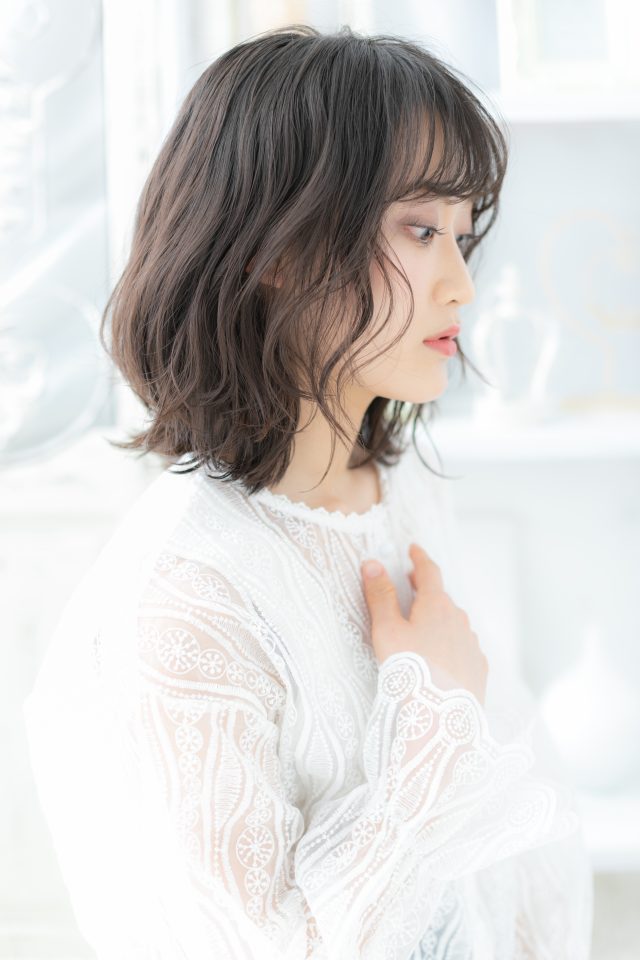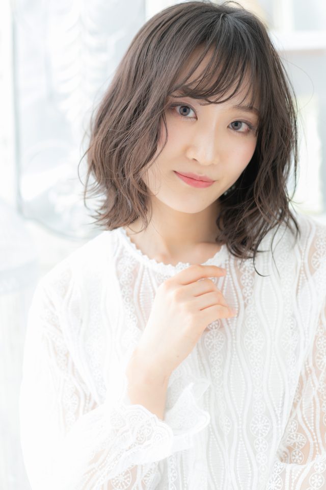 くせ毛風ゆるふわミディや耳かけで韓国風が大人かわいい。前下がりで小顔。斜めバングや厚めバングで目力UP。ナチュラルボブやフェミニンボブ、大人ボブや前下がりボブからのイメチェンに◎(メイク担当:川口店 岩淵)