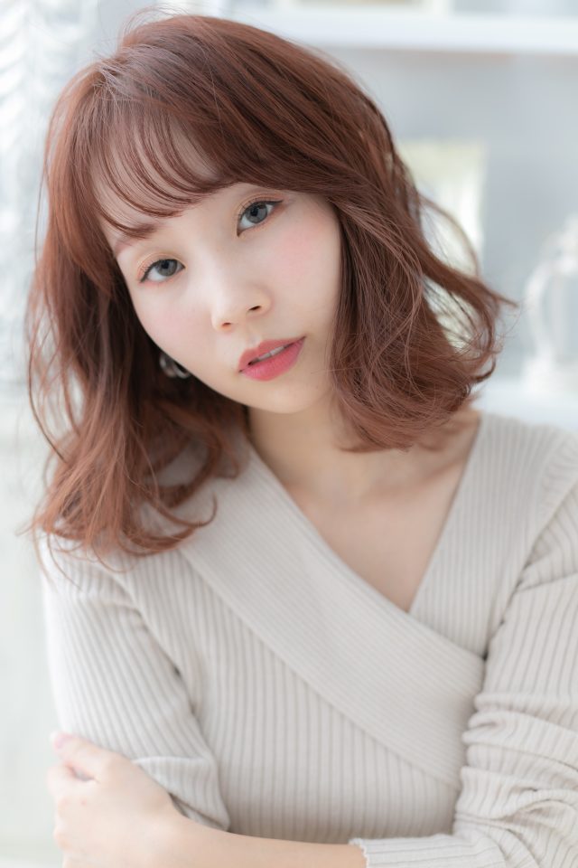 大人可愛いくせ毛風ゆるふわミディ。斜めバングや厚めバング、耳かけもGOOD。前下がりで小顔。ナチュラルボブやフェミニンボブ、大人ボブや前下がりボブ、切りっぱなしボブやウルフも◎(メイク担当:COVERHAIRGROUP成田)