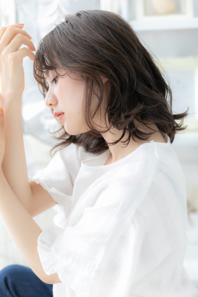 斜めバングや厚めバングで目力UP。前下がりで小顔。ナチュラルボブやフェミニンボブ、大人ボブや前下がりボブからの伸ばしかけに◎くせ毛風ふわミディや耳かけも大人かわいい。(メイク担当:COVERHAIRGROUP中田)